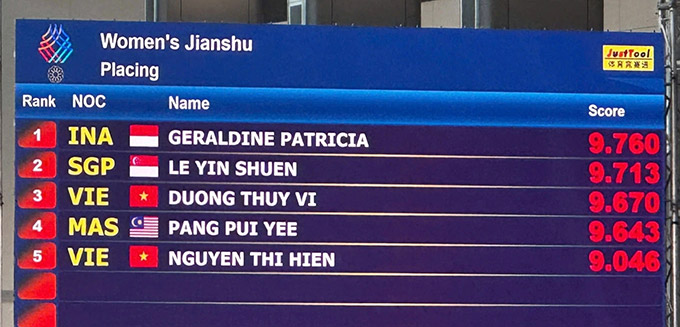 Ở bài thi kiếm thuật của Wushu, Nguyễn Thị Hiền được 9,046 điểm, còn Dương Thuý Vi được 9,670 điểm. Điểm tổng của 3 nội dung quyền, binh khí ngắn (kiếm), binh khí dài (thương) là căn cứ để tính huy chương. Hai VĐV Việt Nam vẫn còn phần thi binh khí dài vào ngày 15/12.