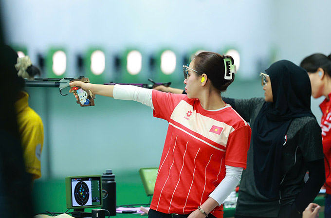 Tấm huy chương vàng thứ 31 cho Thể thao Việt Nam. Thùy Trang, Thu Vinh và Hoa Hồng giúp bắn súng Việt Nam giành huy chương vàng nội dung đồng đội. Trong khi đó, ở nội dung cá nhân, Thùy Trang và Thu Vinh lần lượt dẫn đầu và xếp thứ 2 tại vòng loại 10m súng ngắn nữ, qua đó giành quyền vào chung kết diễn ra vào chiều nay. Một xạ thủ khác là Hoa Hồng nằm ngoài tốp 8 nên không thể đi tiếp. Ảnh: Đức Cường