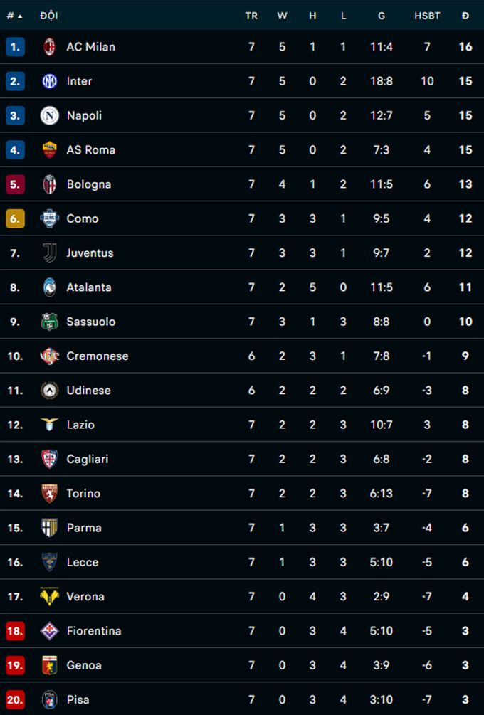 Khoảng cách giữa họ và CLB đứng thứ 4 là Roma chỉ còn 3 điểm. Nếu tiếp tục duy trì phong độ như thế này, Como hoàn toàn có thể mơ đến việc cạnh tranh suất dự cúp châu Âu và kết thúc mùa này trong top 4.