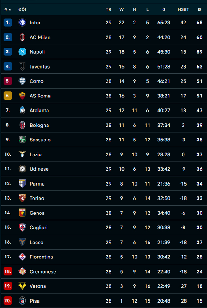 Ở trận đấu còn lại, Juventus đánh bại Udinese với tỷ số 1-0 nhờ công Boga ở phút thứ 38. Thắng trận, Juventus đứng thứ 4 khi có 53 điểm.