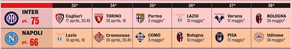 Ở một diễn biến khác, nếu cả Inter và Napoli cùng thắng liên tiếp, đội bóng áo xanh-đen vẫn có thể lên ngôi sớm ở vòng 36 khi làm khách trước Lazio. Khi đó, khoảng cách điểm số vẫn đủ để Napoli không thể san lấp dù mùa giải chưa kết thúc (9 điểm khi giải đấu chỉ còn 2 vòng).