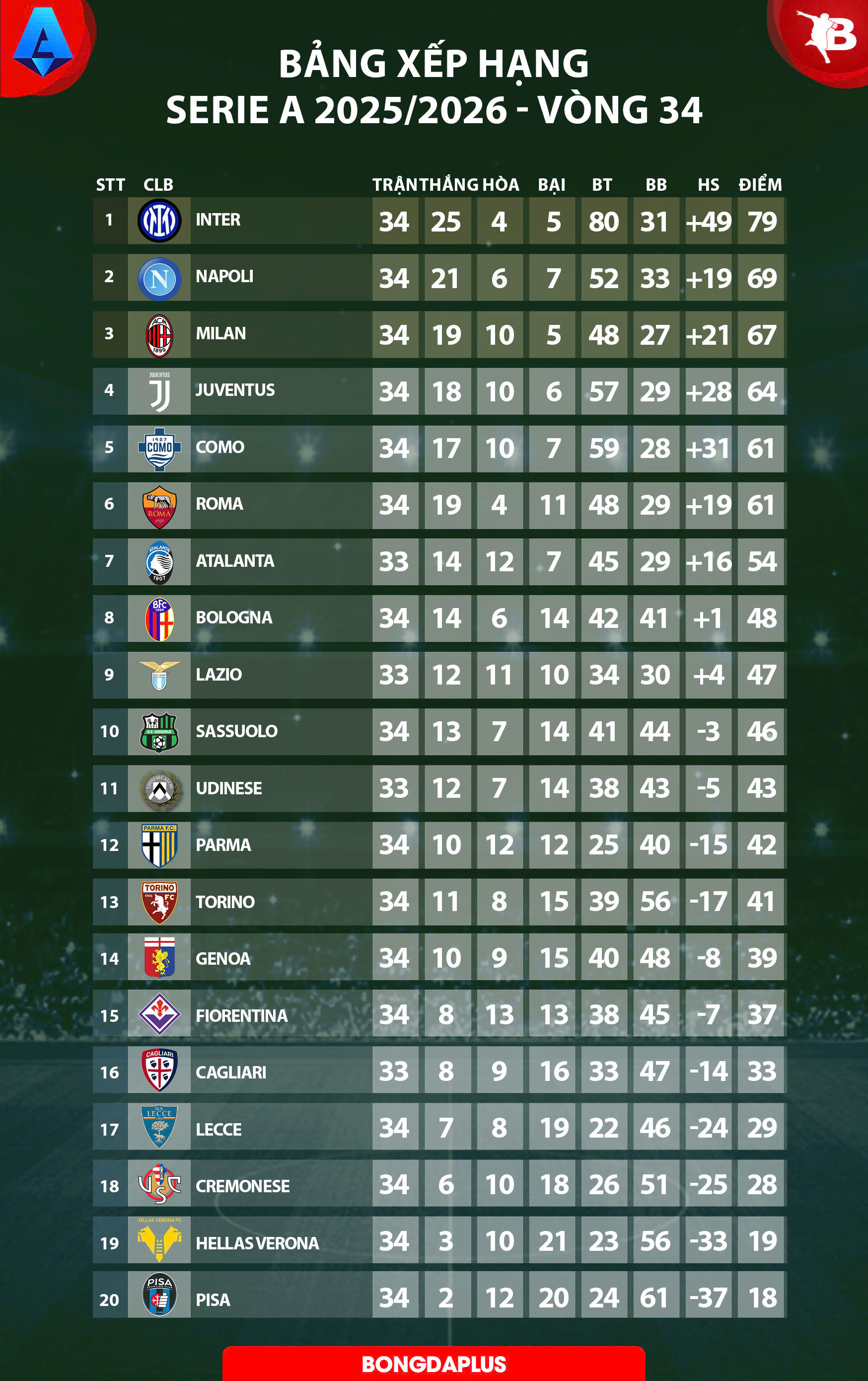 Cuộc cạnh tranh cho suất dự Champions League đang trở nên khốc liệt hơn bao giờ hết khi Como và AS Roma đều giành chiến thắng ở vòng đấu này, cùng có 61 điểm và chỉ còn kém Juventus 3 điểm. Điều đó khiến cuộc đua không chỉ còn là câu chuyện của Milan và Juventus, mà đang mở rộng thành cuộc cạnh tranh nhiều bên, nơi bất kỳ cú sảy chân nào cũng có thể phải trả giá đắt.