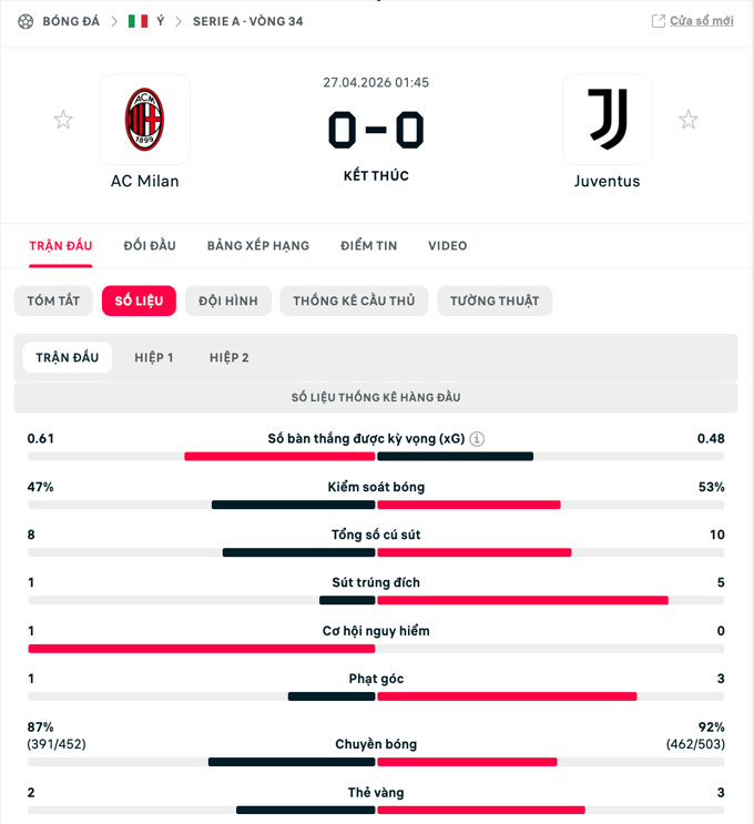 Kết quả này rõ ràng có lợi hơn cho Milan. Đội bóng áo sọc đỏ-đen nâng tổng điểm lên 67, chỉ còn kém Napoli 2 điểm trong cuộc đua top 2, đồng thời vẫn duy trì khoảng cách 3 điểm so với Juventus. Trong khi đó, Juventus có lý do để tiếc nuối khi họ cần một chiến thắng để tạo lợi thế rõ ràng hơn trong cuộc đua top 4.