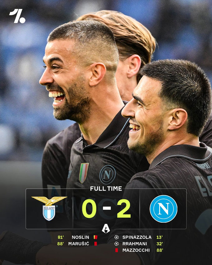 Lazio gặp khó khăn trong việc kiểm soát thế trận và đến phút 32, Napoli đã nhân đôi cách biệt. Politano thực hiện pha đá phạt chính xác, trung vệ Rrahmani đánh đầu thoải mái, đưa bóng vào lưới trong sự bất lực của hàng thủ Lazio.