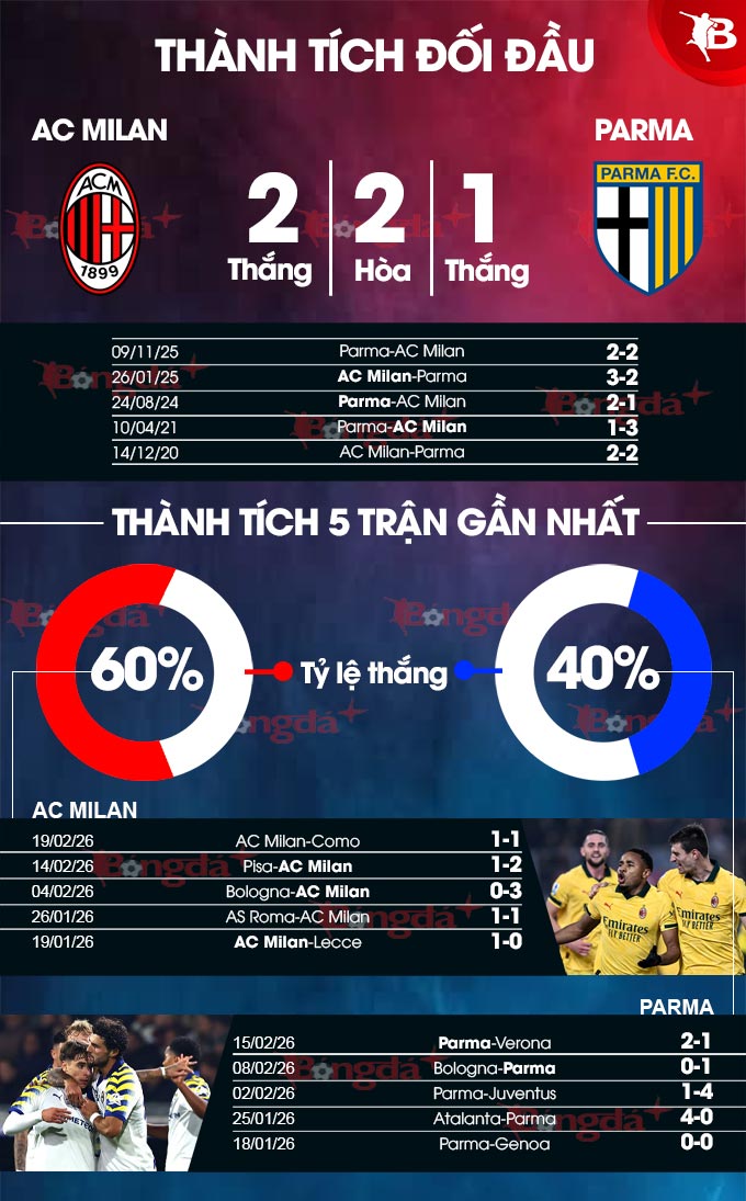 - Nhiều bàn thắng: 2/3 trận gần đây của Milan cùng 3/4 trận vừa qua của Parma đều có từ 3 bàn thắng trở lên. 6 trận đối đầu gần nhất giữa đôi bên cũng có thối thiểu 3 pha làm bàn.