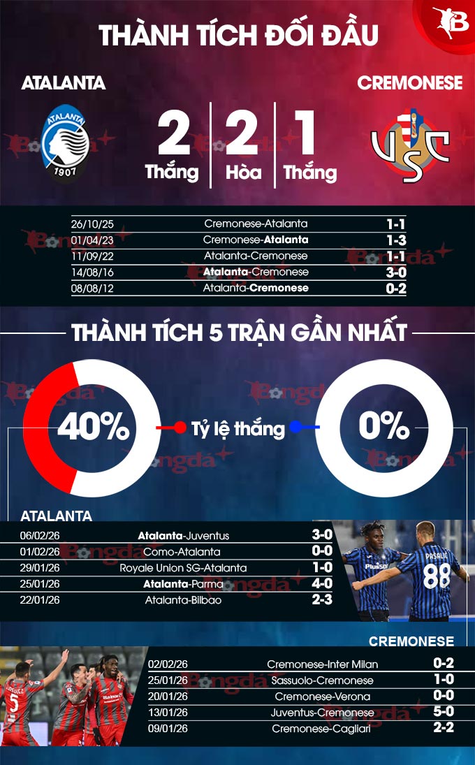 - Chẵn bàn thắng: 6/7 cuộc đối đầu gần nhất, 5/8 trận gần đây của Atalanta và 8/12 trận vừa qua của Cremonese đều khép lại với tổng bàn thắng là chẵn. Ngoài ra, 4/5 cuộc đối đầu gần nhất giữa hai đội tại Bergamo cũng có tổng bàn thắng chia hết cho 2.