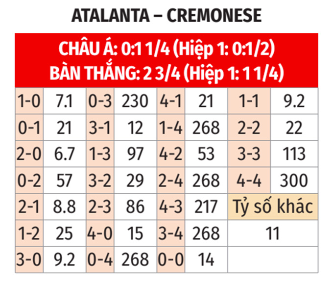 - Atalanta giữ sạch lưới nhà: Atalanta không để thủng lưới bàn nào ở 3/4 trận gần nhất, ở 4/5 trận sân nhà vừa qua. Bên cạnh đó, Cremonese cũng không thể xuyên thủng lưới đối phương ở 8/9 trận gần đây, ở 6/7 chuyến làm khách vừa qua. Được biết, tỷ lệ tin vào khả năng Atalanta giữ sạch lưới nhà là rất sáng, được niêm yết là đặt 1 ăn 2,18.