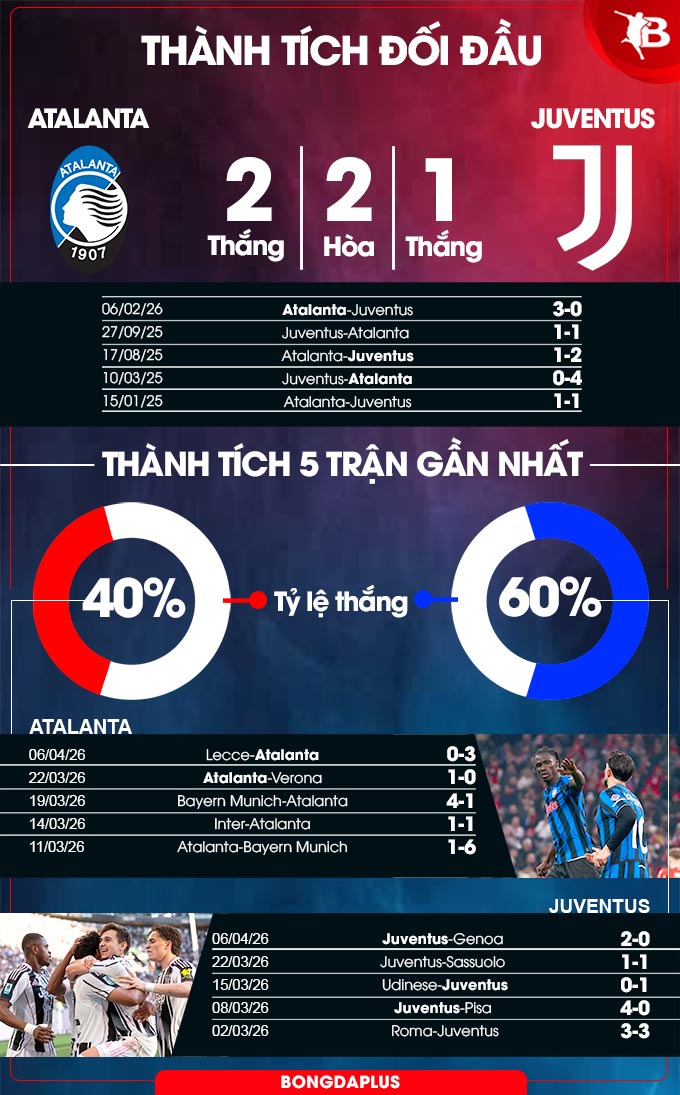 Điều đó cho thấy Atalanta có khả năng tận dụng hiệu quả lợi thế sân nhà, tạo ra bầu không khí áp đảo trước các đội khách. Tuy nhiên, phong độ gần đây của họ trên mọi đấu trường lại khá phập phù, với 2 chiến thắng, 1 trận hòa và 2 trận thua trong 5 trận gần nhất. Và đây là điểm yếu mà Juventus có thể tận dụng.
