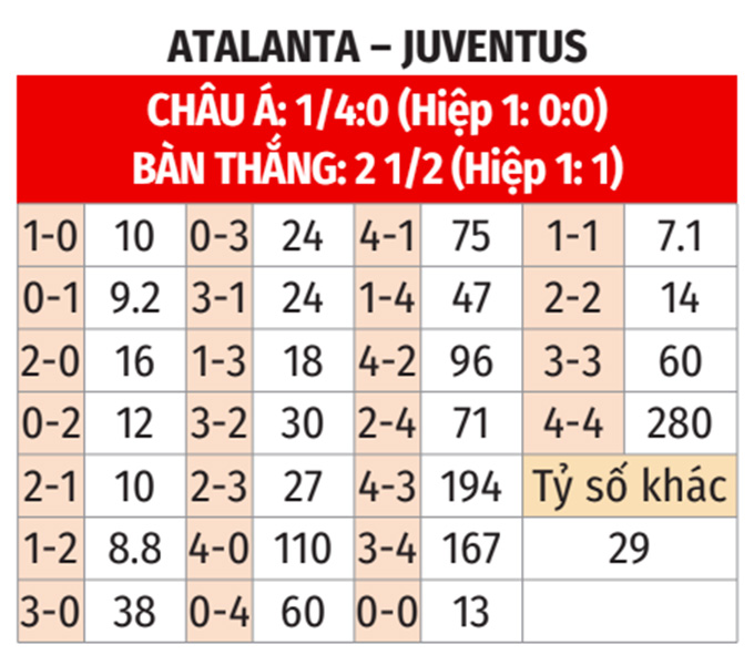- Lẻ bàn thắng: 4/5 cuộc chạm trán gần đây tại Atalanta, 4/5 trận vừa qua của Atalanta và 7/9 chuyến làm khách gần nhất của Juve đều khép lại với tổng bàn thắng là lẻ. Hơn nữa, 11/14 trận sân nhà gần đây của Atalanta cũng có tổng bàn thắng không chia hết cho 2.