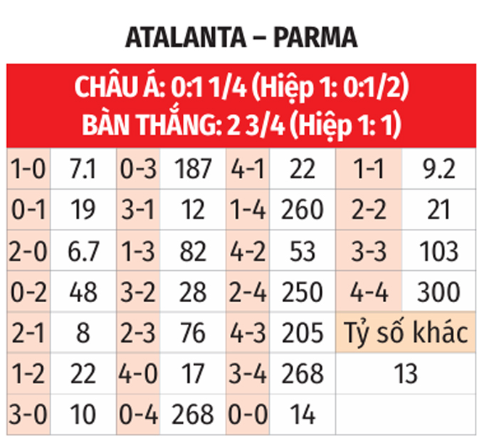 - Lẻ bàn thắng: 7/10 trận so tài gần nhất giữa 2 CLB có tổng bàn thắng không chia hết cho 2. Ngoài ra, 6/10 trận sân nhà vừa qua của Atalanta cùng 5/7 trận mới nhất của Parma kết thúc với kết quả tương tự.