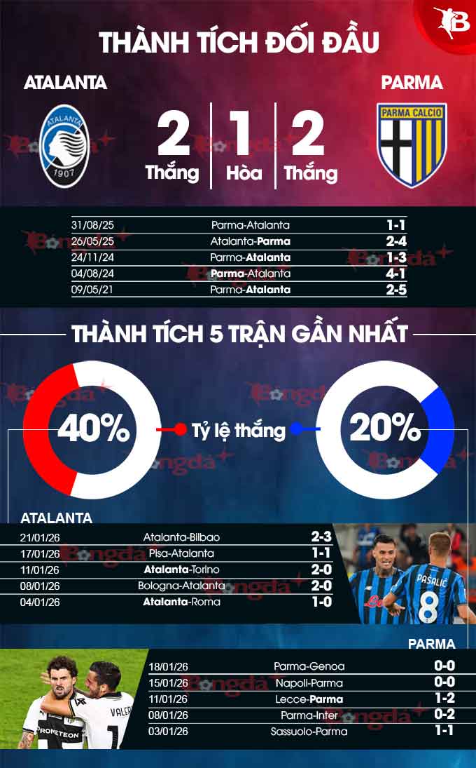 Ngoài ra, thành tích đối đầu của Atalanta cũng tốt hơn. Theo đó, Atalanta thắng 7/10 trận so tài mới đây với Parma. Trong 14 lần hành quân tới sân của Atalanta, Parma chỉ thắng có 2, hòa 3 còn lại là thua 9. Có khả năng, màn đấu tới sẽ kết thúc có lợi nghiêng về Atalanta.