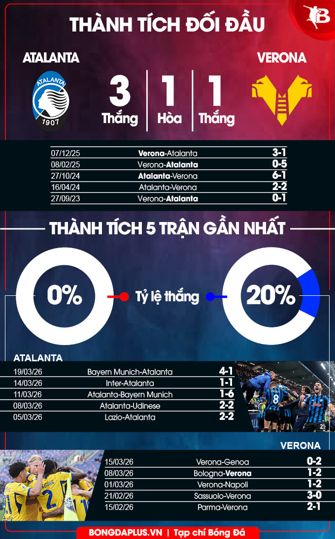 - Nhiều bàn thắng: 4/5 trận vừa qua của Verona đều có ít nhất 3 bàn thắng được ghi. 4/5 trận gần đây của Atalanta cùng 5/6 trận đối đầu gần nhất thậm chí đều có từ 4 bàn thắng trở lên.