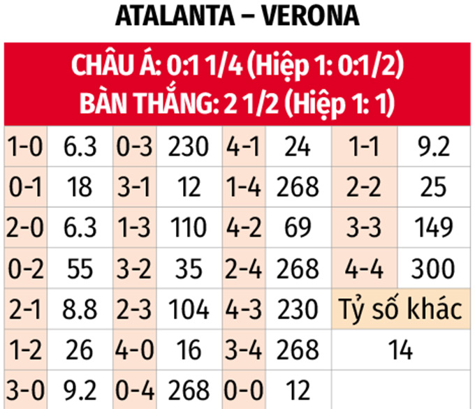 - Atalanta thắng châu Á: Trận đối đầu gần nhất nhường 1 1/4 trái như trận này, Atalanta nghiền nát Verona với tỷ số 5-0. Trong bối cảnh thua châu Á 6, hòa 1 và chỉ thắng 1 trong 8 trận vừa qua, thật khó để đặt niềm tin vào Verona.