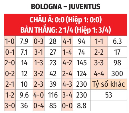 - Từ 2 tới 3 bàn: Cả 4 trận chính thức gần đây của Juve đều có từ 2 tới 3 bàn. Cả 3 trận vừa qua của Bologna và 9/12 lần chạm trán gần nhất giữa đôi bên cũng luôn khép lại với tổng bàn thắng rơi vào đoạn từ 2 đến 3.