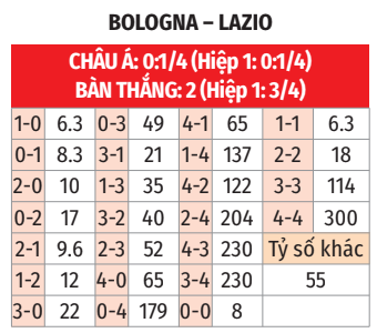 - Lazio từ hòa đến thắng: Lazio bất bại cả 3 trận chính thức gần đây, 100% đem lại niềm vui cho NHM. 14 trận sân nhà vừa qua, Bologna chỉ có đúng 1 lần giúp NHM có niềm vui khi đánh bại Udinese 1-0 trong điều kiện nhường 1/2 bàn. Lazio sẽ từ hòa tới thắng.