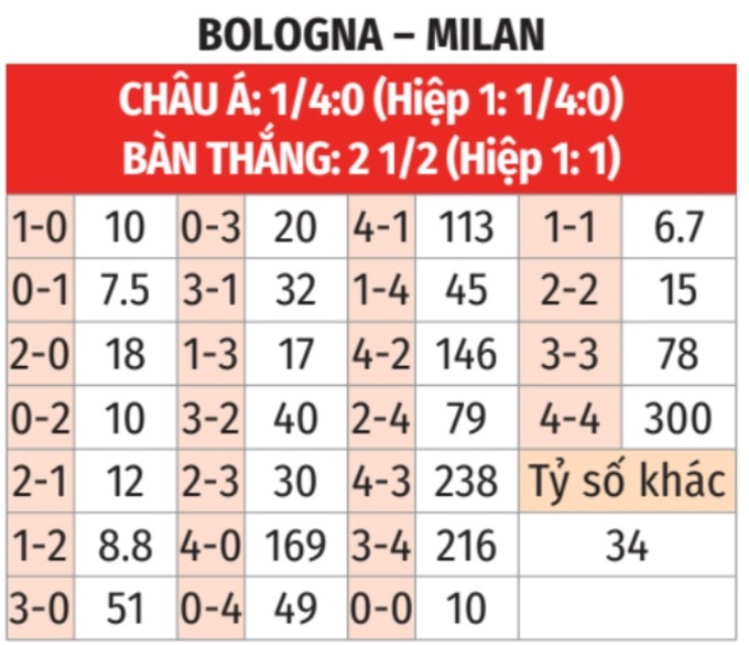 Tóm lại, đây là trận đấu mà khả năng giành 3 điểm của Milan là rất cao. Nếu còn nghi ngờ điều đó, hãy nhìn vào thống kê đối đầu giữa 2 đội gần đây. Theo đó, trong 19 lần mới nhất hành quân đến sân của Bologna trong khuôn khổ Serie A, Milan chỉ phải nhận 1 thất bại, còn lại họ hòa 5 và thắng 13 trận.