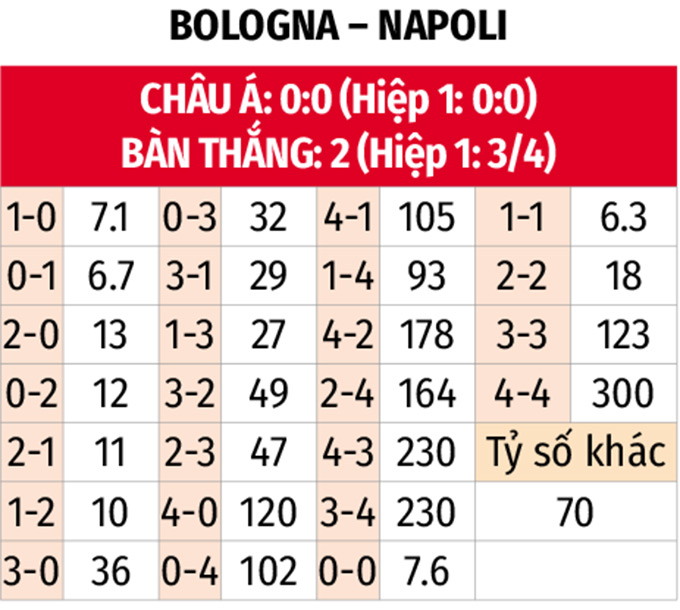 - Tối đa 1 bàn hiệp 1: 4/6 trận sân nhà gần đây của Bologna cùng 3 trận liên tiếp vừa qua của Napoli đều kết thúc hiệp 1 với tỷ số hòa không bàn thắng. 4/5 trận đối đầu gần nhất giữa đôi bên có tối đa 1 bàn trước giờ nghỉ.