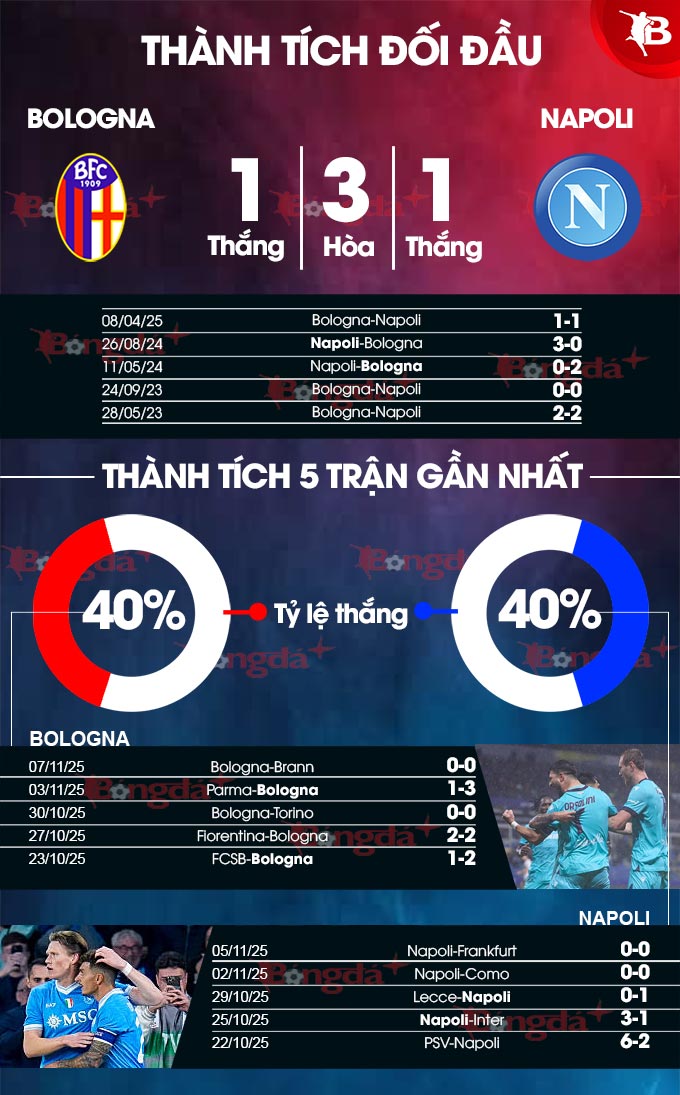 Cần nhấn mạnh rằng, Bologna và Napoli đã hòa nhau trong cả ba lần gặp nhau gần nhất tại thánh địa Dall'Ara. Nếu tính xa hơn, dù được đánh giá rất cao nhưng Napoli chỉ thắng được 1 trong 5 trận gần nhất gặp Bologna, sau khi đã giành chiến thắng 5 lần liên tiếp trước đó. Chính điều này khiến đoàn quân HLV Antonio Conte sẽ gặp thách thức nhất định ở trận đấu này.