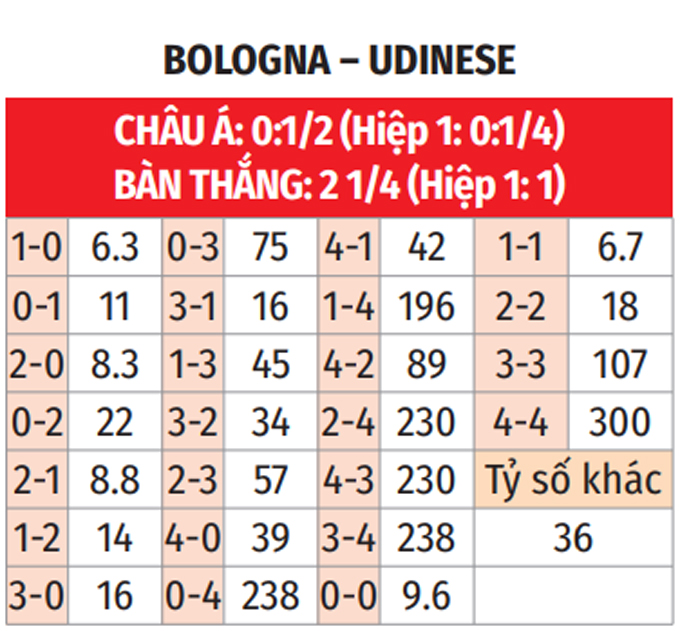 - Chẵn bàn thắng: 6/10 trận so tài trước đây giữa 2 CLB Bologna vs Udinese có tổng bàn thắng chia hết cho 2. Ngoài ra, 7/10 trận sân khách gần đây của Udinese kết thúc với kết quả tương tự. Chưa hết, 6/10 trận gần nhất khi Bologna tiếp Udinese trên sân nhà có số bàn thắng chẵn.