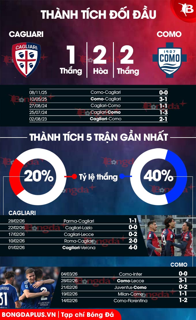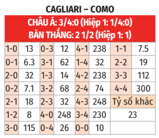 - Từ 2 tới 3 bàn: 6/7 trận chính thức gần đây trên sân khách của Como, 3/4 trận vừa qua của Cagliari và cả 3 lần chạm trán gần nhất giữa đôi bên đều chấm dứt với tổng bàn thắng rơi vào đoạn từ 2 tới 3.