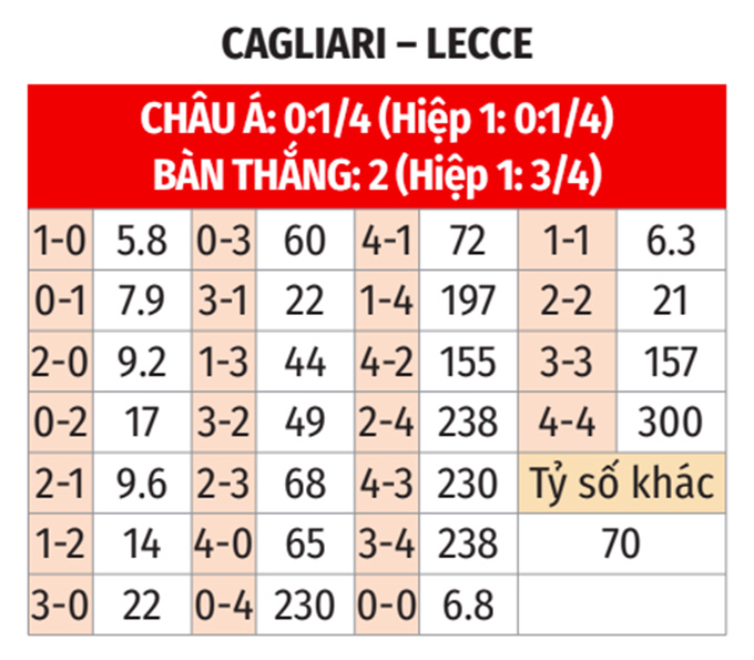 - Cagliari giữ sạch lưới nhà: Cagliari thắng và giữ sạch lưới nhà ở cả 2 trận gần nhất trên sân nhà. Trong khi đó Lecce không ghi được bàn thắng nào ở 6/9 trận gần đây, ở 5/6 chuyến làm khách vừa qua. Được biết, tỷ lệ tin vào khả năng Cagliari giữ sạch lưới nhà ở trận này khá sáng, được niêm yết là đặt 1 ăn 2,98.