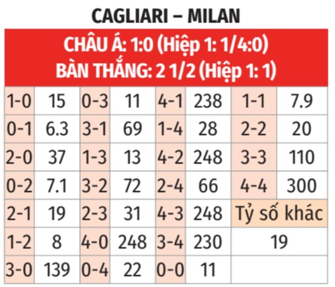 - Lẻ bàn thắng: 3/4 trận đấu gần đây của Cagliari kết thúc với tổng số bàn thắng là số lẻ. Tình trạng tương tự xảy ra ở 5/7 trận vừa qua của Milan.