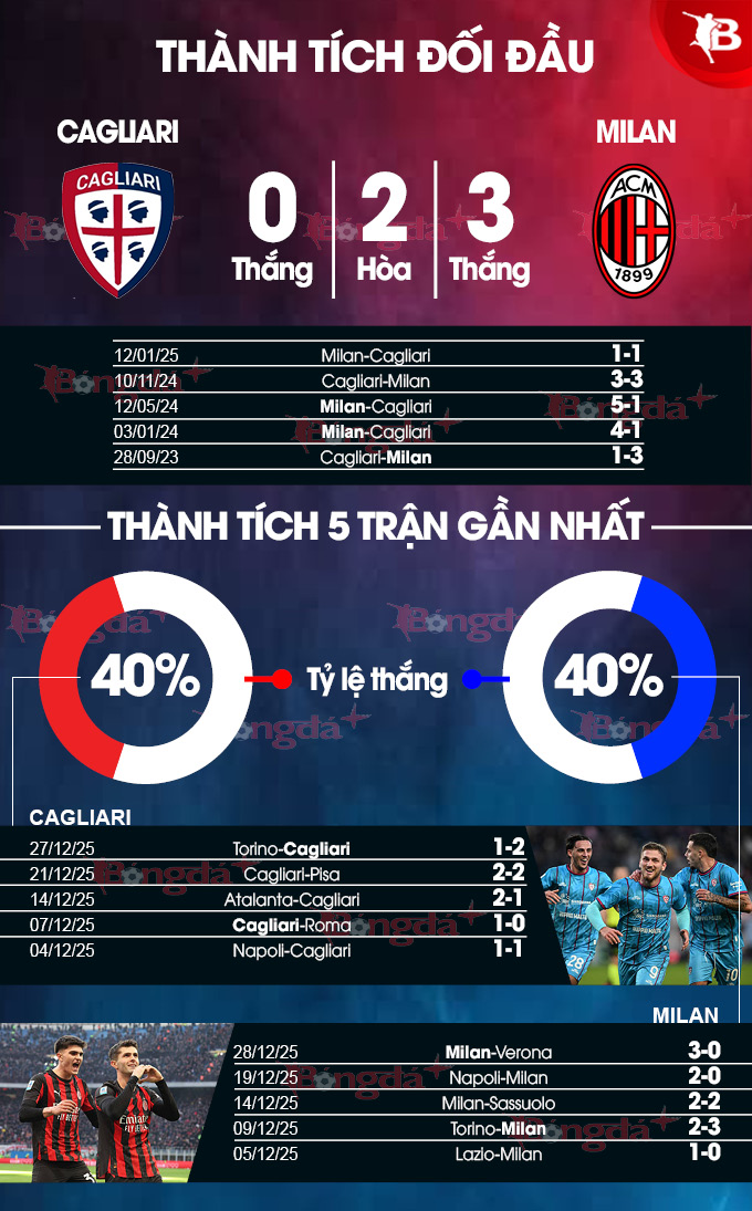 Vì thế, Milan hành quân đến sân của Cagliari cuối tuần này với mục tiêu duy nhất là giành trọn vẹn 3 điểm. Đội bóng của HLV Max Allegri có cơ sở để tin vào khả năng sẽ ca khúc khải hoàn. Cagliari không phải là đối thủ xứng tầm với đội bóng áo sọc đỏ đen.
