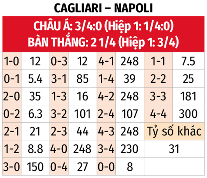 - Napoli thắng theo châu Á hiệp 1: Các cầu thủ Napoli đang nhập cuộc rất chủ động gần đây, khi toàn thắng châu Á 3 trận liên tiếp trong hiệp đầu tiên. Với Cagliari, đội chủ nhà thua châu Á hiệp 1 ở 2 trận vừa qua cùng 3/4 trận đối đầu gần nhất.