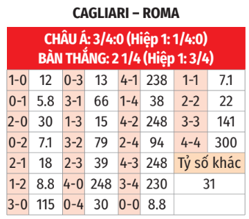 - Từ 2 tới 3 bàn: 5/6 trận chính thức gần đây khi Roma nhường đối phương 3/4 bàn trở lên khép lại với 2 hoặc 3 lần lưới rung. 12/14 trận sân nhà vừa qua của Cagliari cũng có từ 2 đến 3 bàn.