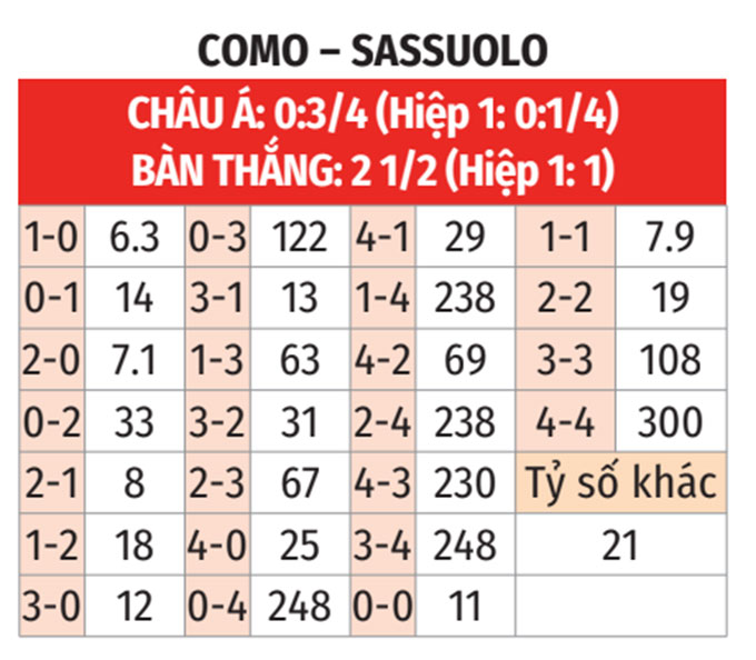 - Ít nhất 4 thẻ vàng: 5/7 trận vừa qua của Sassuolo đều có ít nhất 4 thẻ vàng. 3/4 trận gần đây của Como cũng diễn ra theo kịch bản tương tự.