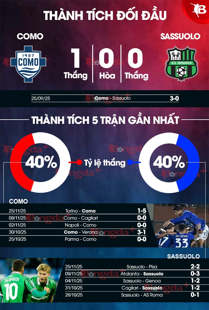 Riêng trên sân nhà, Como đã không thua cả 6 trận ở Serie A 2025/26. Trong 6 trận này, đáng chú ý có 2 trận họ đánh bại những đối thủ sừng sỏ như Juventus và Lazio đều với tỷ số 2-0. Đã có yếu tố địa lợi mà lại đang duy trì được phong độ đáng nể như vậy, Como hứa hẹn sẽ là thử thách khó vượt qua dành cho Sassuolo.