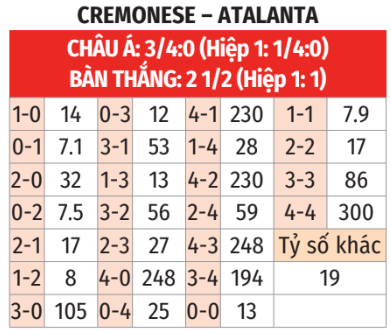 - Từ 2 tới 3 bàn: Cả 3 trận chính thức gần đây khi Cremonese được nhường không quá 1 ½ bàn đều có từ 2 tới 3 bàn thắng. 5/7 trận Serie A vừa qua của Atalanta và 3/4 lần đối đầu gần nhất giữa đôi bên ở giải chính thức cũng khép lại với tổng bàn thắng rơi vào đoạn từ 2 tới 3.