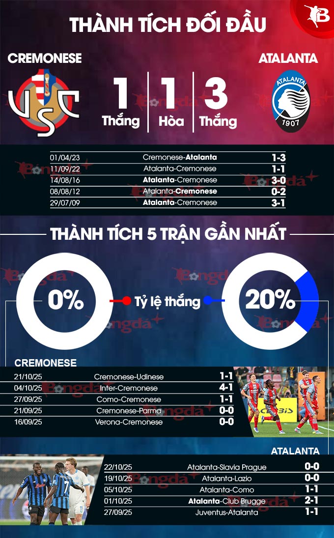 5 lần gần nhất đối đầu Cremonese ở các giải đấu chính thức, Atalanta thắng 4 và hòa 1, chỉ thủng lưới đúng 2 lần. Đội khách sẽ giành 3 điểm.