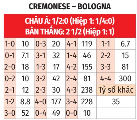 - Hiệp 1 hòa 0-0: 6/8 trận gần đây của Bologna hòa 0-0 trong 45 phút đầu. Biến cố tương tự cũng xảy ra ở 4/6 trận gần nhất của Cremonese tại Serie A. Nếu 45 phút đầu hòa 0-0 thì cũng đồng nghĩa với việc ít bàn hiệp 1.