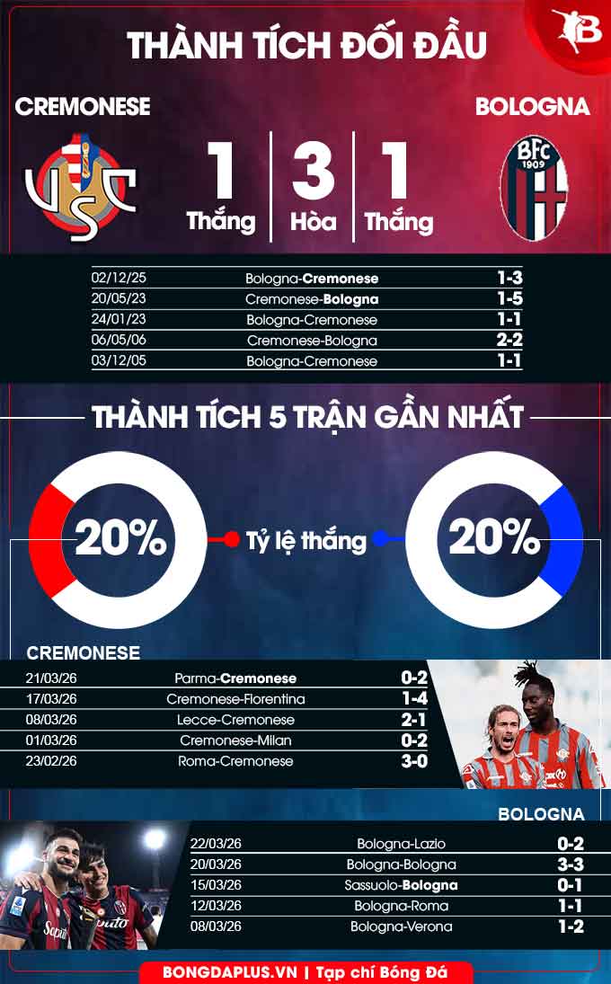 Cremonese đang ở vị trí nguy hiểm chính vì phong độ kém cỏi trên sân nhà. Họ mới chỉ giành 12 điểm/14 trận sân nhà đã đấu. Tuy nhiên, thắng lợi 1-0 trên sân của Parma vòng trước đã ít nhiều giúp đội bóng thành phố Cremona vực dậy niềm tin. Với sự phân tâm của Bologna, Cremonese có khả năng gây bất ngờ.