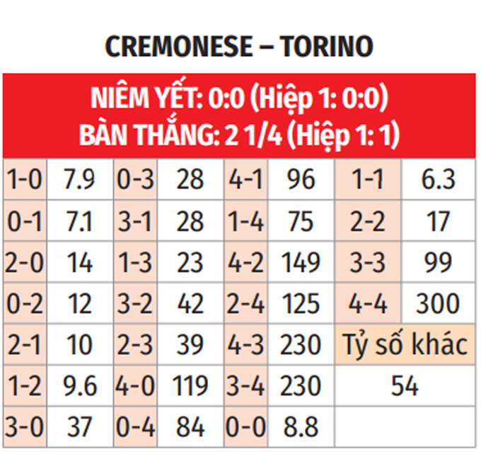 - Lẻ bàn thắng: 7/10 trận so tài gần nhất giữa hai đội có tổng bàn thắng không chia hết cho 2. Chưa hết, 6/10 trận mới đây của Cremonese và 8/10 trận vừa xong của Torino chứng kiến điều tương tự.