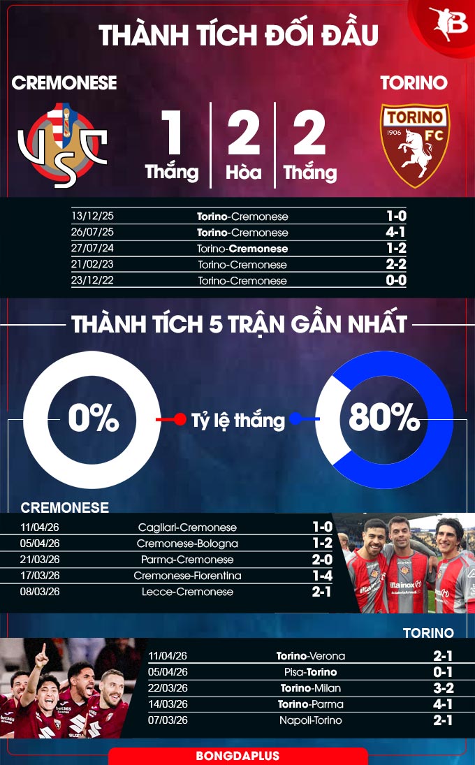Ở trận đấu gần nhất tại Serie A 2025/26, Cremonese và Torino có kết quả khác nhau. Trong khi Cremonese bại trận trước chủ nhà Cagiari thì Torino thắng Verona 2-1.