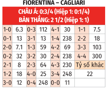 - Fiorentina thắng theo châu Á: Cagliari là đội… đứng đầu Serie A mùa này về thành tích theo châu Á trên sân khách. Trên BXH, họ cũng đang hơn Fiorentina 5 điểm và 3 bậc. Chẳng có lý do gì để Fiorentina nhường tới 3/4 bàn, cách niêm yết như thế này báo hiệu sự thắng thế của đội chiếu trên. Thuận lợi cho La Viola khi họ áp đảo Cagliari về đối đầu, đội bóng áo tím thắng 6, hòa 1 và thua 2 theo châu Á trong 9 lần chạm trán gần nhất.