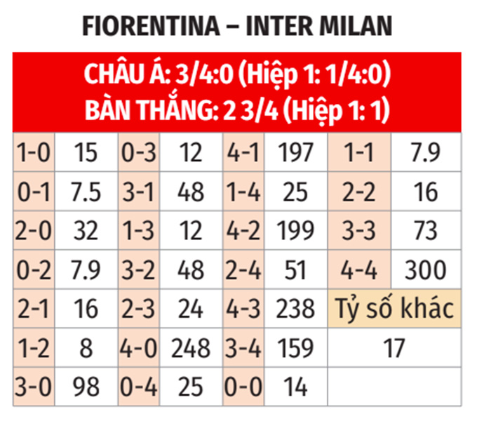 Với những phân tích nói trên, nhiều khả năng Inter sẽ vượt khó thành công tại Fio. Nhiều thẻ phạt, Inter ghi bàn hiệp 1 và trận đấu sẽ có bàn thắng ở 30 phút cuối là những kịch bản rất dễ xảy ra ở trận này.
