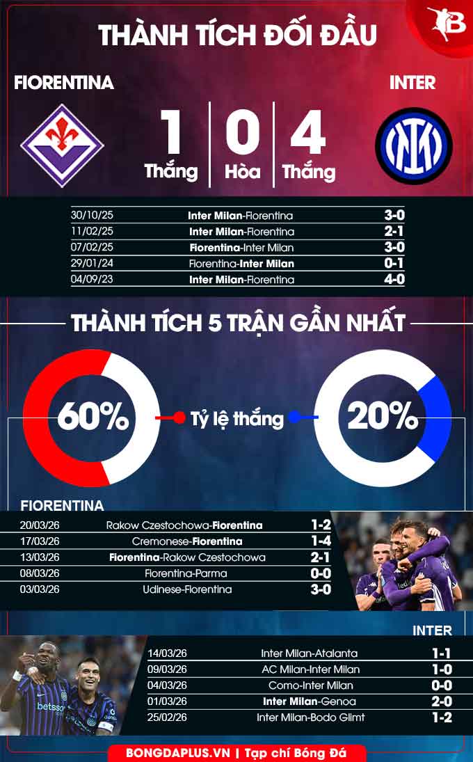 - Inter ghi bàn hiệp 1: Inter ghi bàn trong hiệp 1 ở 5/8 cuộc đối đầu gần nhất, ở 7/11 trận vừa qua và ở 7/9 chuyến làm khách gần đây tại sân của Fiorentina. Rất có thể trận này sẽ lại có kịch bản tương tự trong hiệp 1.
