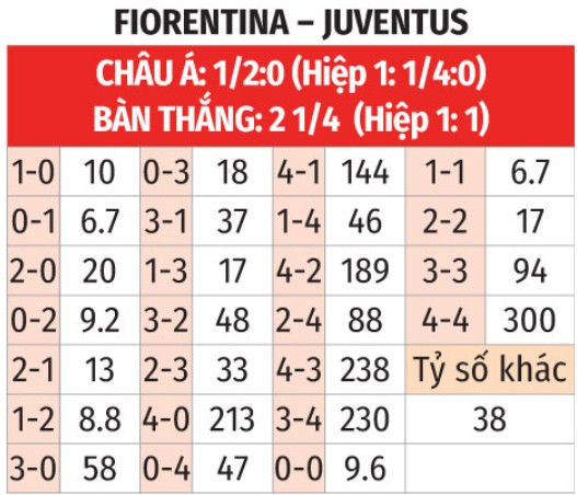 - Từ 2 tới 3 bàn: 3/4 trận sân khách gần đây của Juve ở Serie A có 2 tới 3 bàn, tương tự 4/5 trận sân nhà vừa qua của Fiorentina tại các giải đấu chính thức xảy ra biến cố tương tự. 8/10 lần đối đầu gần nhất tại Florence tính riêng ở Serie A cũng chấm dứt với số bàn thắng rơi vào đoạn từ 2 đến 3.
