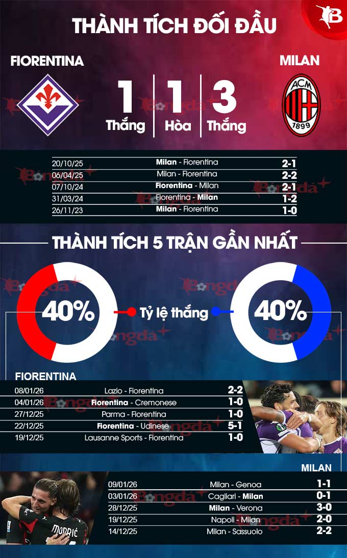 Nhìn chung, đây là trận đấu mà Fiorentina không có một chút hy vọng giành chiến thắng. Nếu còn nghi ngờ, hãy nhìn vào đối đầu giữa 2 đội gần đây. Theo quan sát, đội bóng áo sọc đỏ đen áp đảo trong 5 cuộc đụng độ gần đây với Fio khi giành 3 chiến thắng, hòa 1, chỉ phải nhận 1 thất bại.
