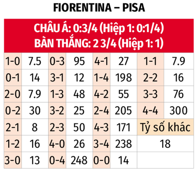 - Tối đa 1 bàn hiệp 1: 4 trận liên tiếp vừa qua của Fiorentina xuất hiện tối đa 1 bàn thắng trong 45 phút đầu tiên với tổng cộng 3 lần lưới rung. Với Pisa, hàng công đội khách tịt ngòi 3 trận gần đây trước giờ nghỉ, đồng thời trận đối đầu ở lượt đi hòa không bàn thắng.