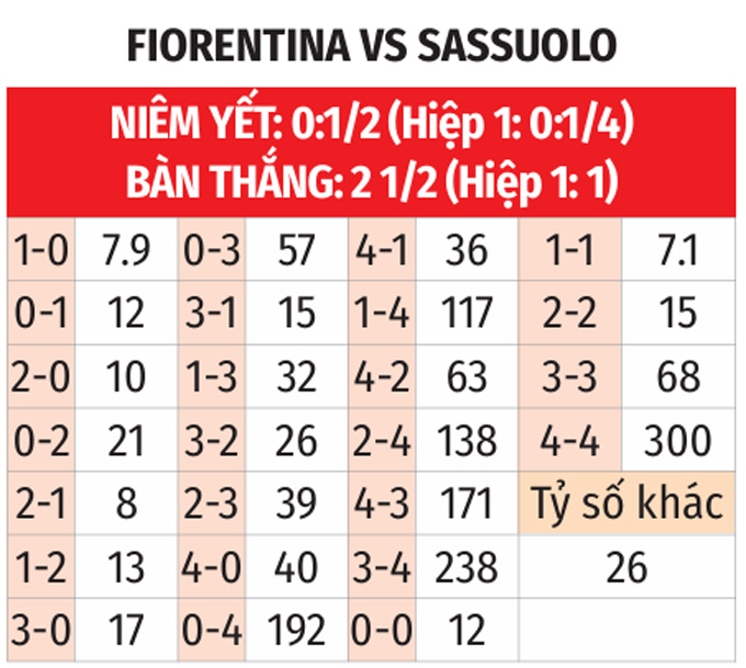 - Hiệp 1 có bàn thắng: 5/7 trận đối đầu gần nhất giữa 2 đội có bàn thắng trong hiệp 1. 5/6 trận vừa qua của Fiorentina và 6 trận liền gần đây của Sassuolo cũng chung kịch bản.