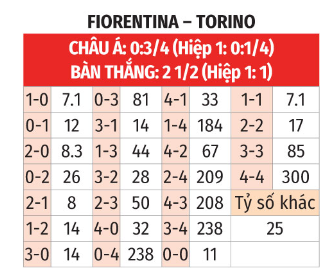 - Fiorentina thắng theo châu Á: Fiorentina vừa thua đồng thời thua theo châu Á 3 trận liên tiếp nên vẫn nhường Torino 3/4 bàn là khá bất thường, nhất là khi họ còn đang kém Torino 5 bậc và 9 điểm trên BXH. Torino thua theo châu Á 4/5 trận Serie A vừa qua. Trong 7 lần chạm trán gần nhất trên sân Artemio Franchi, Fio có tới 5 lần thắng theo châu Á.