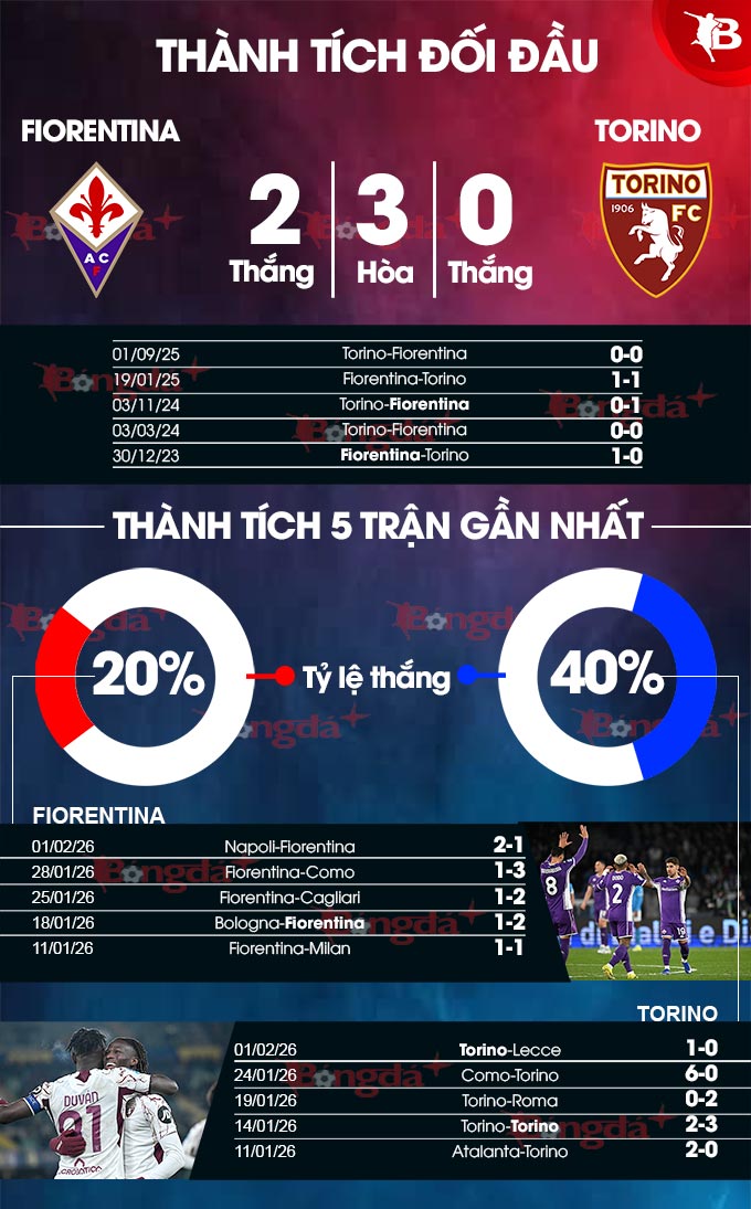 - Từ 2 tới 3 bàn: Cả 4 trận Serie A gần đây của Fiorentina đều có từ 2 tới 3 bàn. 2/3 trận sân khách vừa qua của Torino và 7/10 lần đối đầu gần nhất trên sân Artemio Franchi khi Fio nhường 1/2 đến 3/4 bàn cũng xảy ra biến cố nêu trên.