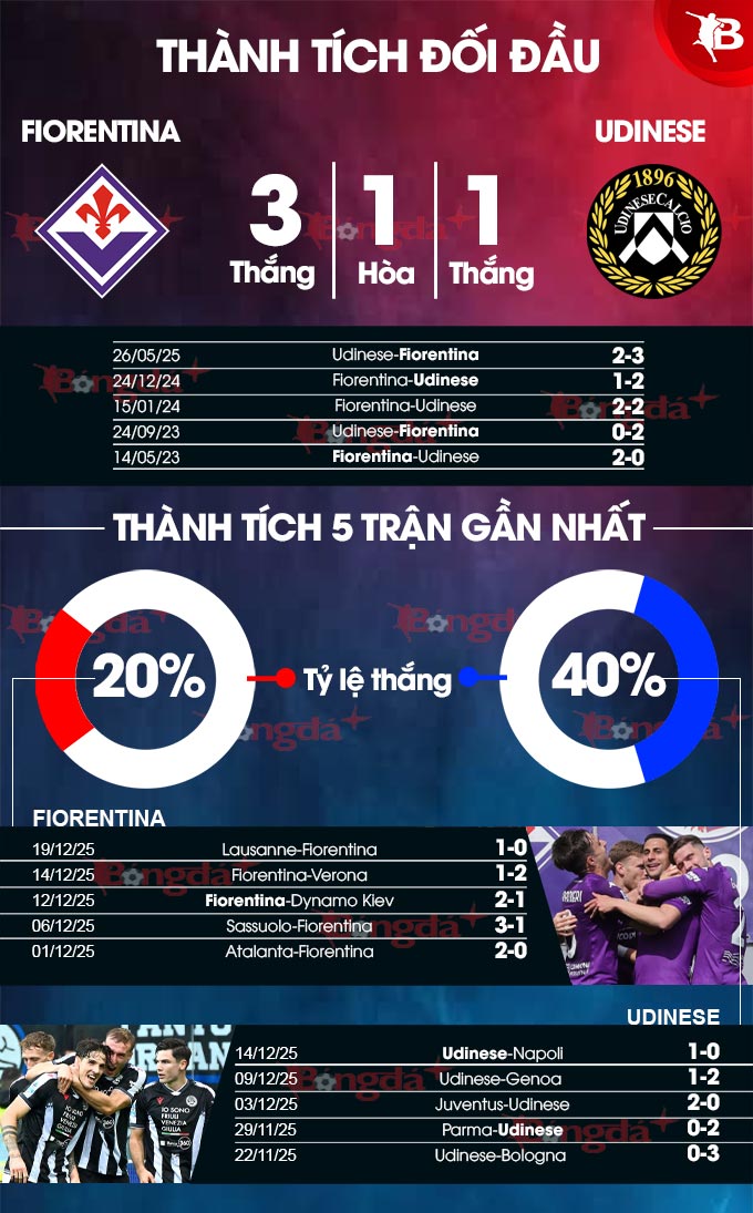 Có lẽ sẽ không dễ dàng cho Fio khi Udinese có phần nhỉnh hơn ở 4 lần đối đầu gần nhất tại sân Artemio Franchi với 2 chiến thắng, 1 trận hòa và chỉ 1 thất bại.