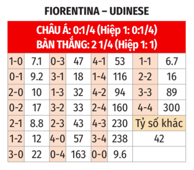 - 2 hoặc 3 bàn cả trận: 5/7 trận gần nhất của Fiorentina và 4/5 trận gần đây của Udinese đều khép lại với 2 hoặc 3 bàn cả trận. Ngoài ra, 5/8 trận sân nhà vừa qua của Fiorentina tại Serie A và 4/5 chuyến làm khách gần đây của Udinese đều có 2 hoặc 3 bàn cả trận.