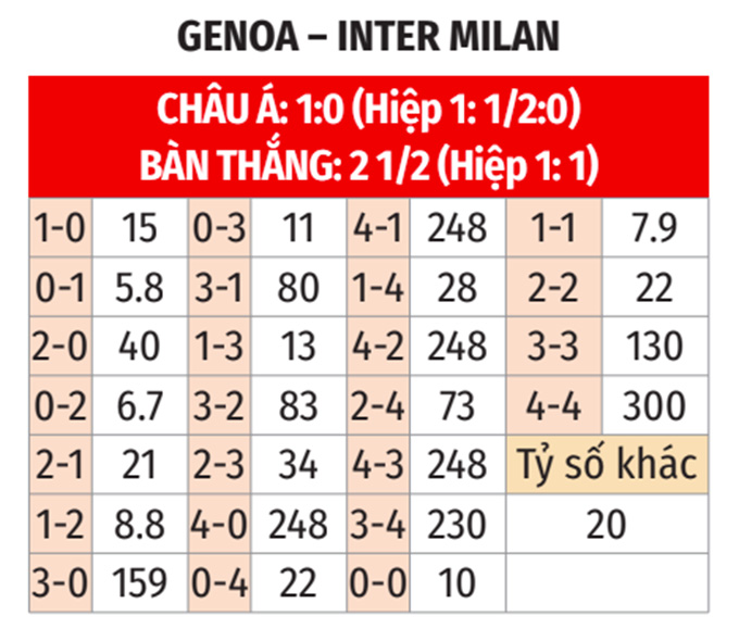 - Từ 3 bàn trở lên: 8/12 cuộc đối đầu gần nhất, cả 6 trận gần đây của Genoa và 8/12 trận vừa qua của Inter đều có ít nhất 3 lần lưới rung cả trận. Hơn nữa, 3/4 chuyến xa nhà gần đây của Inter cũng chứng kiến không dưới 3 bàn thắng cả trận. Xem ra, trận này khó có ngoại lệ.