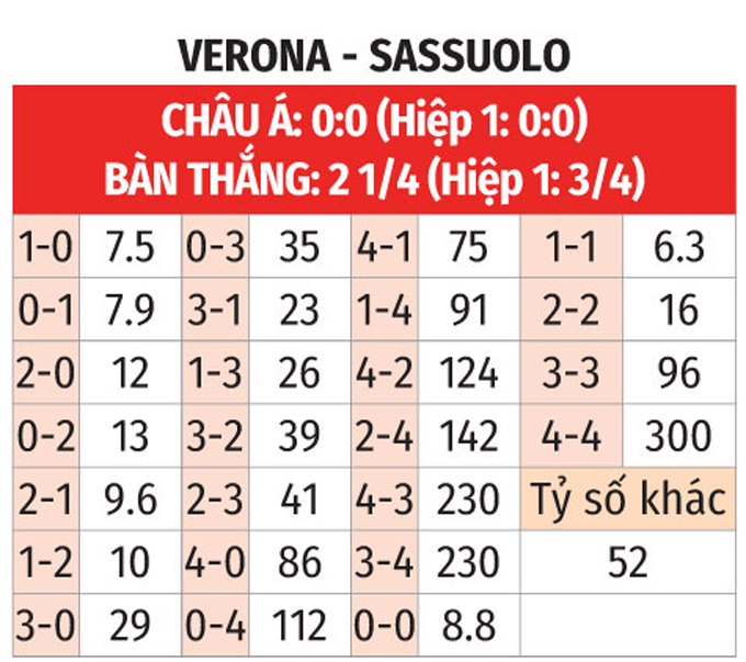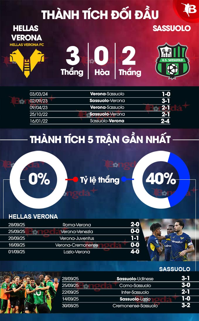 Điểm tựa cho Verona là 2 lần gần nhất tiếp đón Sassuolo trên sân nhà, họ đều có 3 điểm. Có khả năng, Verona lại có niềm vui ở trận này.